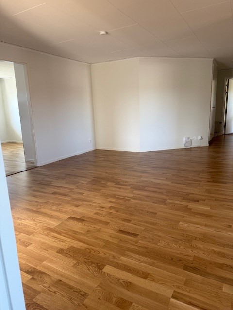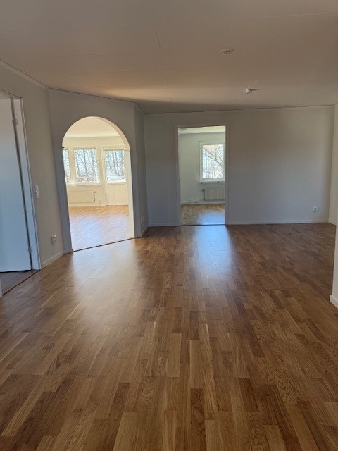 Två sov rum stor hall och ett rum är öppet och används som matsal.