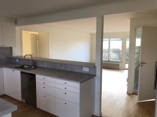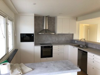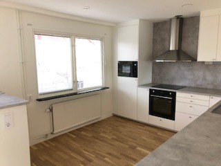 I köket som är ljust och fint finner ni en bardisk ut mot vardagsrumet som gör att det blir luftigt.